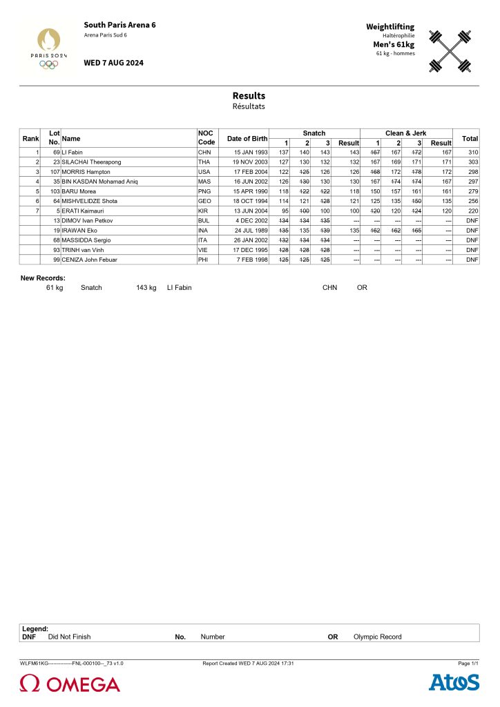 Sementara itu, pingat emas dipertahankan oleh atlet China, Li Fabin dengan angkatan seberat 310kg manakala pingat perak pula dibawa pulang oleh atlet jiran tetangga, Thailand, Theerapong Silachai dengan jumlah angkatan 303kg.