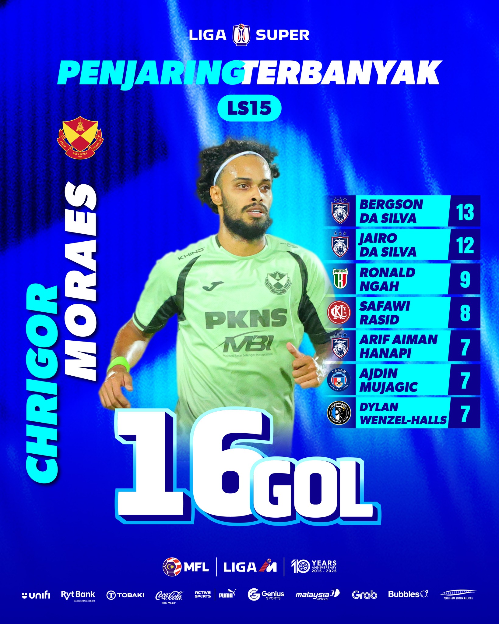 Penyerang Selangor FC dari Brazil, Chrigor Moraes kini memimpin carta penjaring terbanyak Liga Super 2025-26 selepas meledak empat gol ketika bertemu DPMM FC, pada Sabtu.