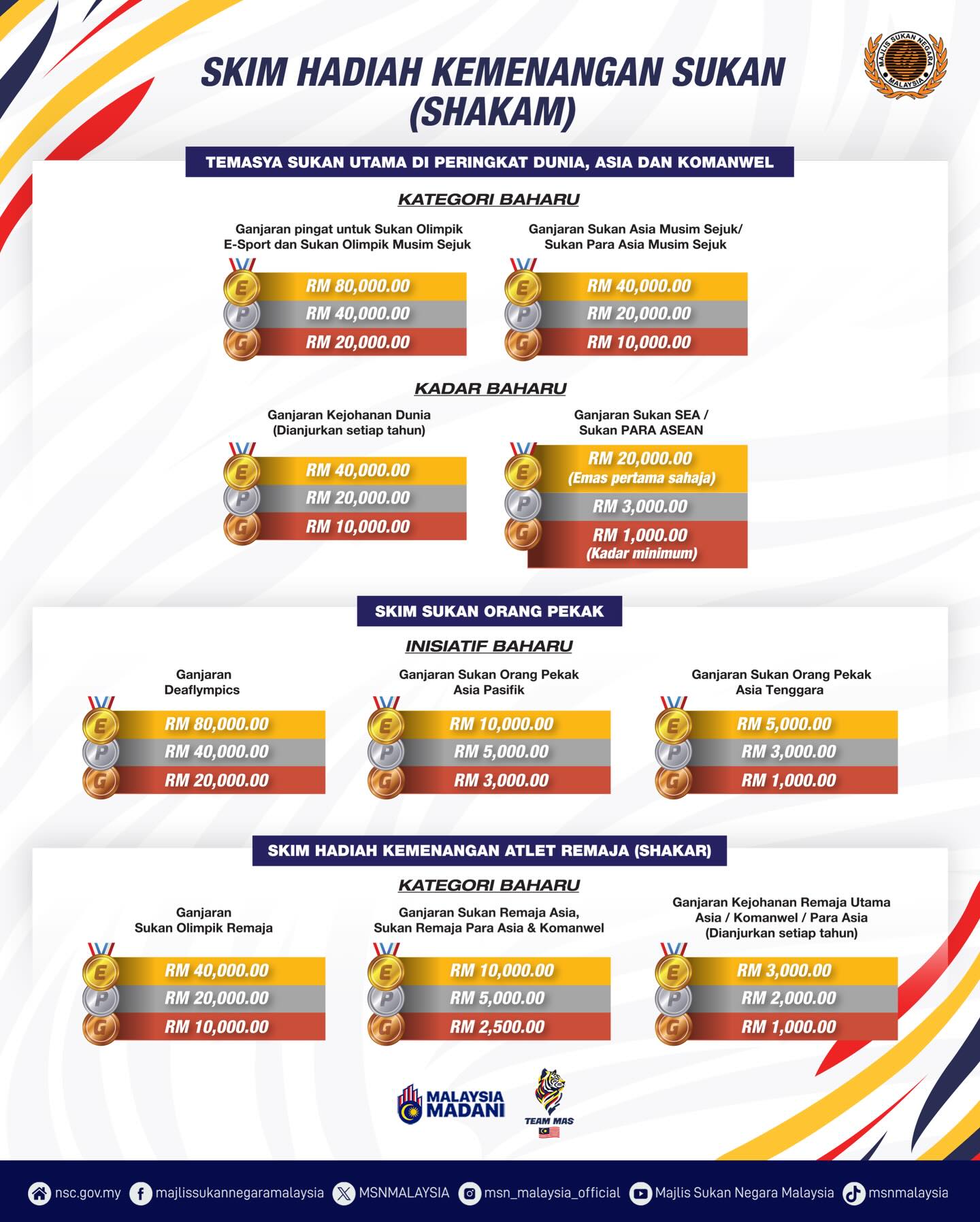 Pada masa yang sama, pihak MSN turut menjelaskan bahawa ganjaran itu turut menyaksikan pemenang pingat gangsa bagi sukan berpasukan mendapat RM1,000 bagi setiap anggota pasukan.